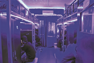 “我們的整體設計是一個太空艙。”鄧亞東說,他打開27日晚上拍的照片,宿舍四個同學都坐在自己的座位上,房頂中央的白熾燈被關上,從床邊和房頂四周延伸過去的LED燈帶閃著藍色的光,從門口看去,確實像是進了一個微型艙內。