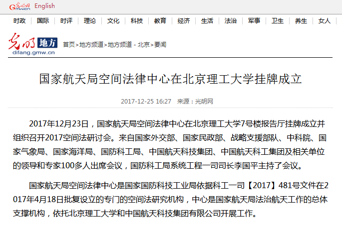 【光明網(wǎng)】國家航天局空間法律中心在北京理工大學(xué)掛牌成立