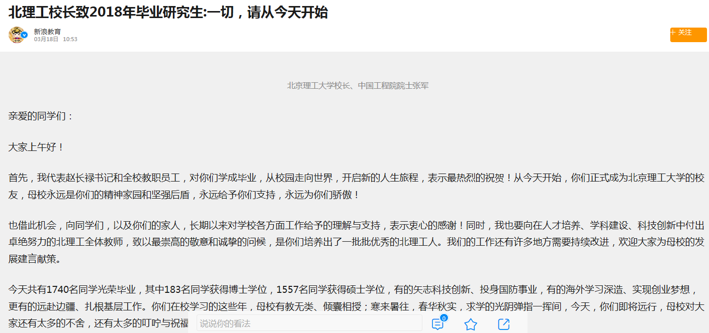 【新浪網】北理工校長致2018年畢業研究生:一切,請從今天開始