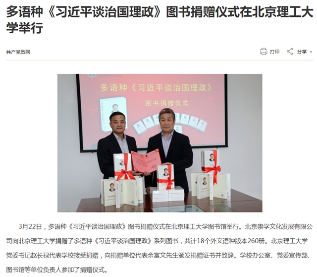 【共產黨員網】多語種《習近平談治國理政》圖書捐贈儀式在北京理工大學舉行