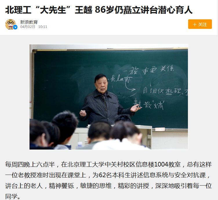 【新浪網(wǎng)】北理工“大先生”王越 86歲仍矗立講臺潛心育人