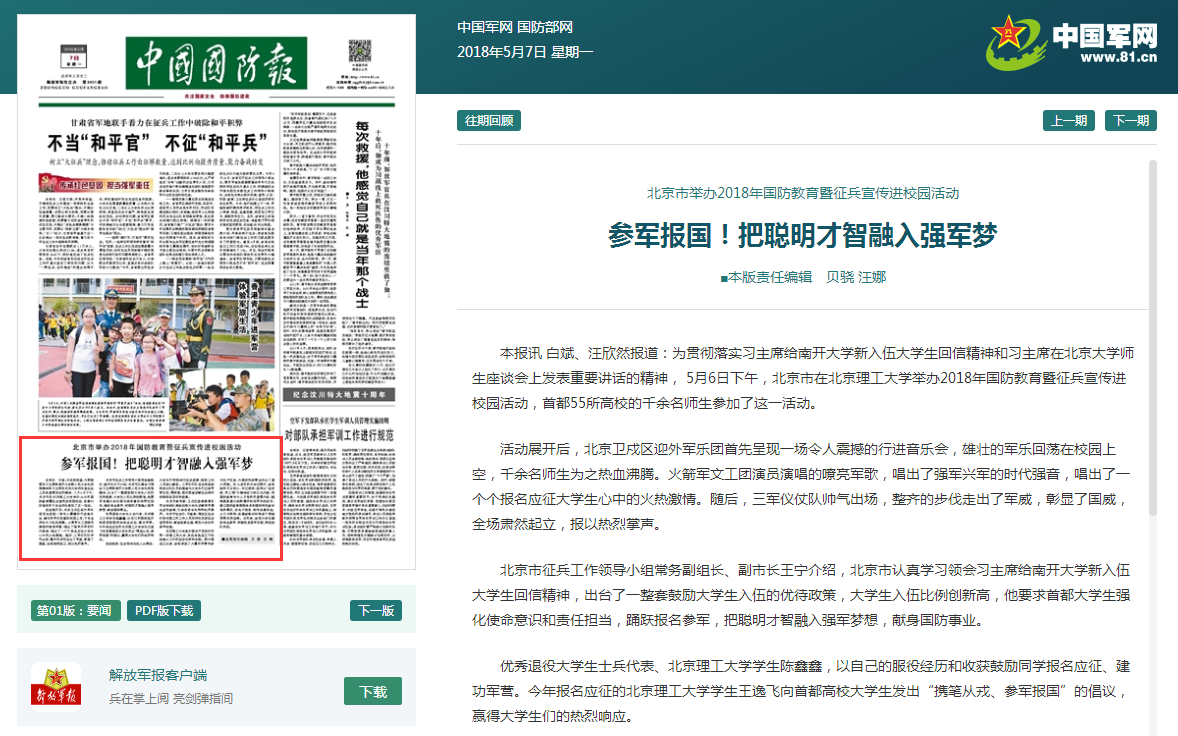 【編者按】為貫徹落實習主席給南開大學新入伍大學生回信精神和習主席在北京大學師生座談會上發表重要講話的精神, 5月6日下午,北京市在北京理工大學舉辦2018年國防教育暨征兵宣傳進校園活動,首都55所高校的千余名師生參加了這一活動。新華網、人民網、《北京日報》《中國國防報》、騰訊網、新浪網等各大媒體第一時間進行了報道。