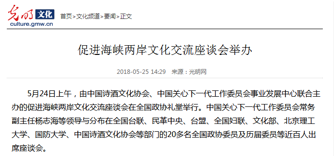 5月24日上午,由中國詩酒文化協會、中國關心下一代工作委員會事業發展中心聯合主辦的促進海峽兩岸文化交流座談會在全國政協禮堂舉行。中國關心下一代工作委員會常務副主任楊志海等領導與分布在全國臺聯、民革中央、臺盟、全國婦聯、文化部、北京理工大學、國防大學、中國詩酒文化協會等部門的20多名全國政協委員及歷屆委員等近百人出席座談會。