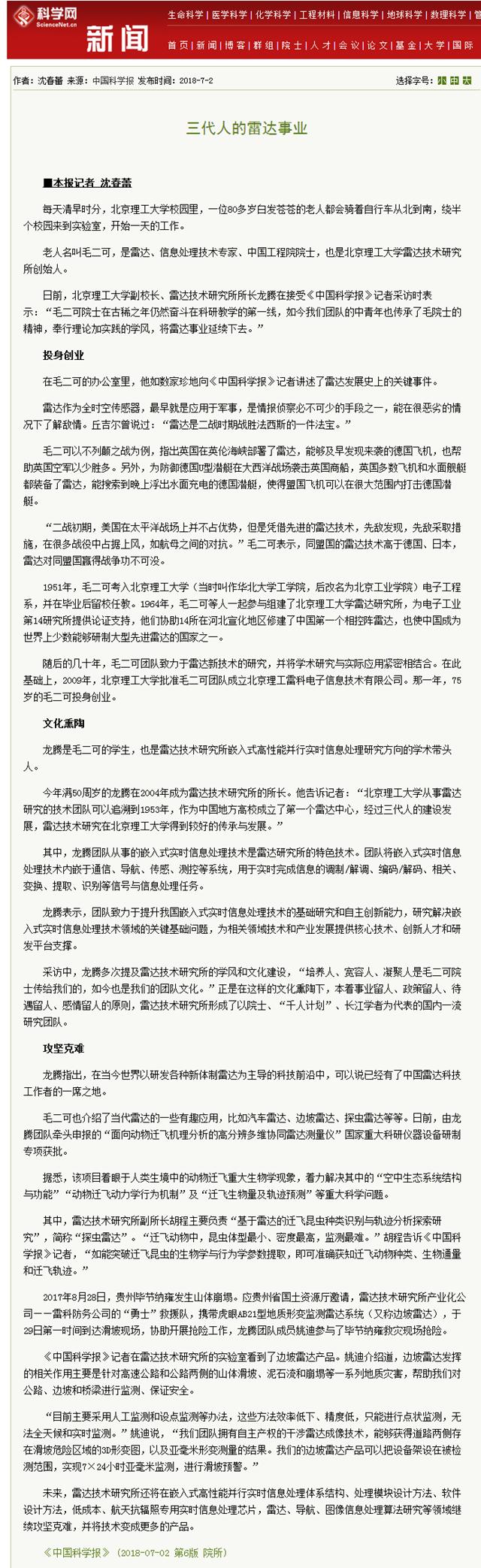 日前,北京理工大學副校長、雷達技術研究所所長龍騰在接受《中國科學報》記者采訪時表示:“毛二可院士在古稀之年仍然奮斗在科研教學的第一線,如今我們團隊的中青年也傳承了毛院士的精神,奉行理論加實踐的學風,將雷達事業延續下去。”