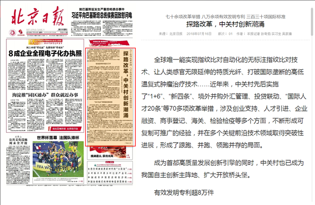 全球唯一能實現指紋比對自動化的無標注指紋比對技術、讓人類感官無限延伸的特質光纖、打破國際壟斷的高低溫復式腫瘤治療技術……近年來,中關村先后實施了“1+6”、“新四條”、境外并購外匯管理、投貸聯動、“國際人才20條”等70多項改革舉措,涉及創業支持、人才引進、企業融資、商事登記、海關、檢驗檢疫等多個方面,不斷形成可復制可推廣的經驗,并在多個關鍵前沿技術領域取得突破性進展,形成了跟跑、并跑、領跑并存的局面。