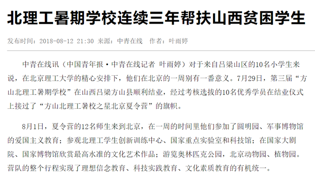 【中青在線】北理工暑期學校連續三年幫扶山西貧困學生