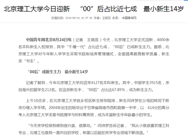 原文標(biāo)題:北京理工大學(xué)今日迎新 “00”后占比近七成 最小新生14歲