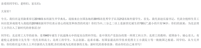 我可以很高興地告訴大家,你們這一批新生,來到北京理工大學正當其時!今年,學校啟動了新時期最大規模最深層次的人才培養改革,大類招生大類培養全面展開,正式實施“書院制”育人體系,你們成為第一批受益者,精工、睿信、求是、明德……等9大書院將是你們大學生活的家園,你們是被寄予厚望的第一批“書生”。