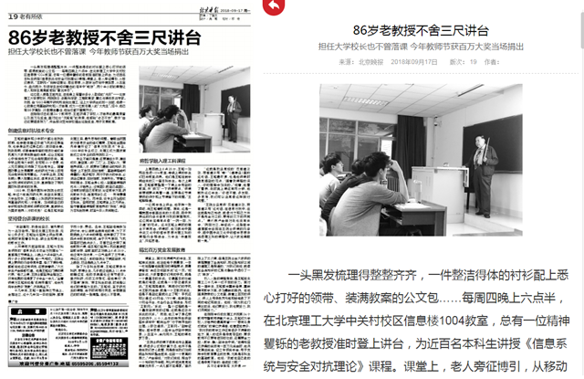 一頭黑發梳理得整整齊齊,一件整潔得體的襯衫配上悉心打好的領帶、裝滿教案的公文包……每周四晚上六點半,在北京理工大學中關村校區信息樓1004教室,總有一位精神矍鑠的老教授準時登上講臺,為近百名本科生講授《信息系統與安全對抗理論》課程。課堂上,老人旁征博引,從移動通訊、“互聯網+”到辯證理論、老莊思想,從醫學治療到中美貿易,從古至今、由內而外,引領學生在知識融合的海洋中“暢游”,兩個半小時的課程讓老人和學生常常都感到“意猶未盡”。