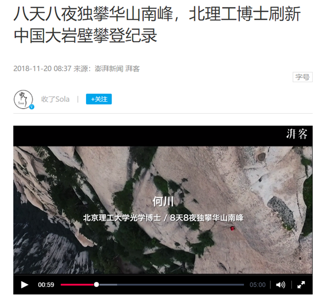 【澎湃新聞】北理工教師何川:刷新中國大巖壁攀登紀錄