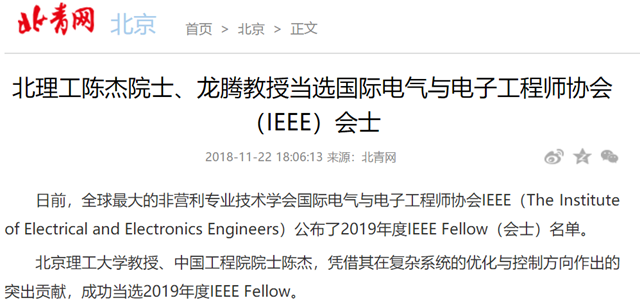 【北青網】北理工陳杰院士、龍騰教授當選國際電氣與電子工程師協會(IEEE)會士