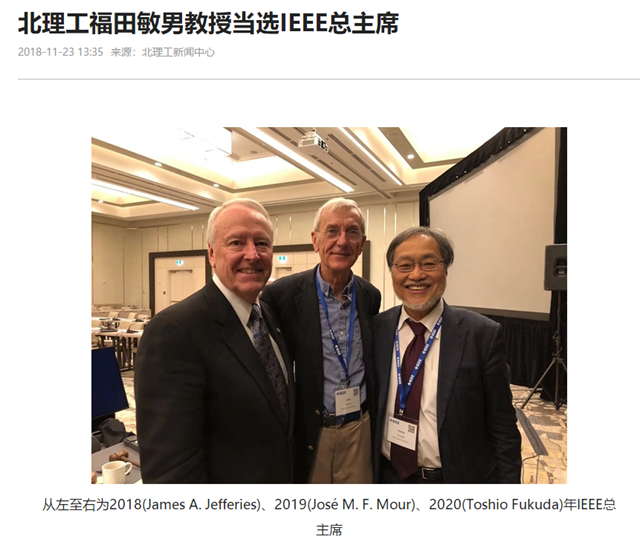 近日,國際電氣與電子工程師協會(IEEE)官方公布了2019年度IEEE總主席選舉結果,并經2018年11月18日董事會討論后,北京理工大學全職教授、博士生導師、中科院外籍院士、IEEE終身會士福田敏男教授當選為2020年IEEE總主席。在2019至2021的三年中,福田敏男教授都將參與IEEE全球管理事務。