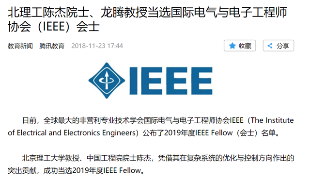 【騰訊網】北理工陳杰院士、龍騰教授當選國際電氣與電子工程師協會(IEEE)會士