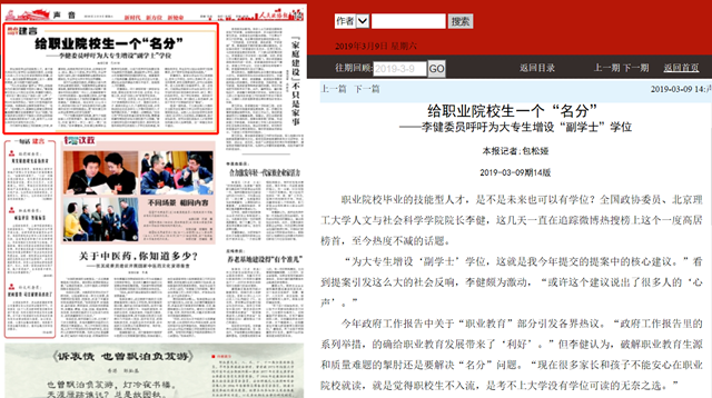 而作為全國政協(xié)委員,李健沒少參與有關(guān)職業(yè)教育的調(diào)研?!拔覈叩嚷殬I(yè)教育迅速發(fā)展,高職教育招生規(guī)模已經(jīng)占到整個普通本專科招生數(shù)的一半以上。但高職教育專門的學(xué)位制度卻一直未能建立起來,這嚴(yán)重阻礙了我國技能人才培養(yǎng)的質(zhì)量提升和體系建設(shè)?!崩罱√寡?,其實早在2014年6月,國務(wù)院印發(fā)《關(guān)于加快發(fā)展現(xiàn)代職業(yè)教育的決定》中就明確提出,要“研究建立符合職業(yè)教育特點的學(xué)位制度”。