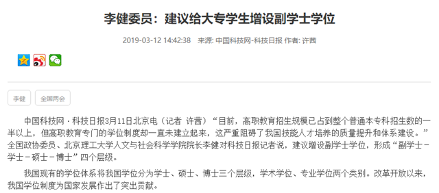 【兩會?中國科技網】李健委員:建議給大專學生增設副學士學位