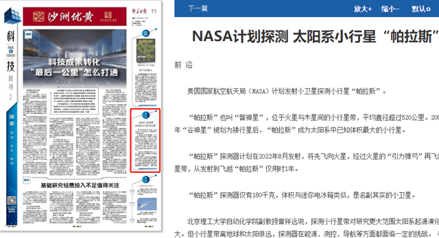 【新華日報】NASA計劃探測 太陽系小行星“帕拉斯”