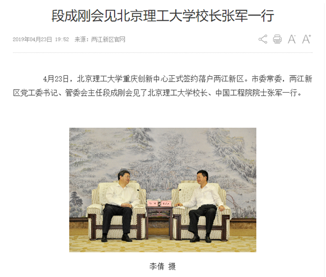 4月23日,北京理工大學重慶創新中心正式簽約落戶兩江新區。市委常委,兩江新區黨工委書記、管委會主任段成剛會見了北京理工大學校長、中國工程院院士張軍一行。