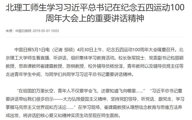 【中國日報網(wǎng)】北理工師生學(xué)習(xí)習(xí)近平總書記在紀(jì)念五四運(yùn)動100周年大會上的重要講話精神