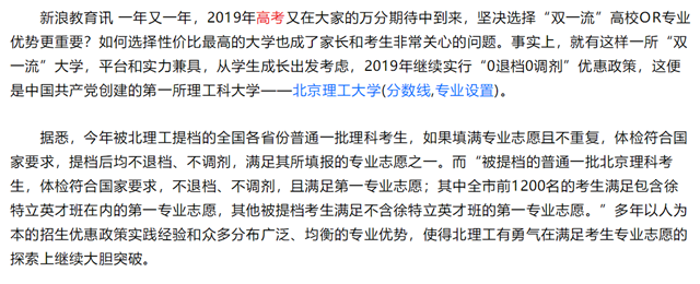 一年又一年,2019年高考又在大家的萬分期待中到來,堅決選擇“雙一流”高校OR專業優勢更重要?如何選擇性價比最高的大學也成了家長和考生非常關心的問題。事實上,就有這樣一所“雙一流”大學,平臺和實力兼具,從學生成長出發考慮,2019年繼續實行“0退檔0調劑”優惠政策,這便是中國共產黨創建的第一所理工科大學——北京理工大學(分數線,專業設置)。