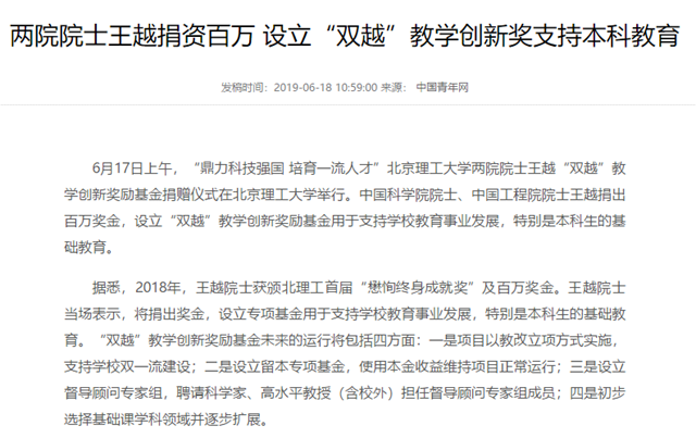 【中國青年網(wǎng)】兩院院士王越捐資百萬 設(shè)立“雙越”教學(xué)創(chuàng)新獎支持本科教育