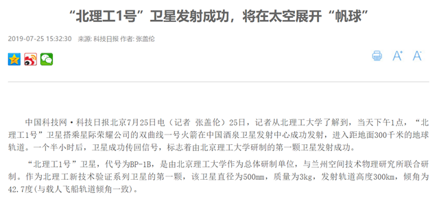【中國科技網】“北理工1號”衛星發射成功,將在太空展開“帆球”