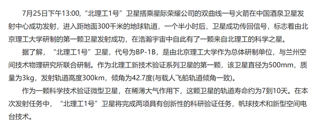 7月25日下午13:00,“北理工1號”衛星搭乘星際榮耀公司的雙曲線一號火箭在中國酒泉衛星發射中心成功發射,進入距地面300千米的地球軌道,一個半小時后,衛星成功傳回信號,標志著由北京理工大學研制的第一顆衛星發射成功,在浩瀚宇宙中自此有了一顆來自北理工的科學之星。