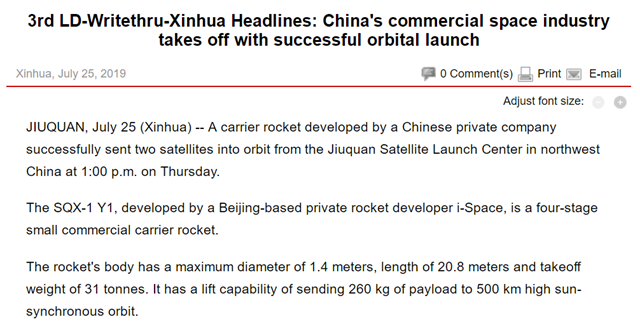 【中國網】3rd LD-Writethru-Xinhua Headlines: China's commercial space industry takes off with successful orbital launch