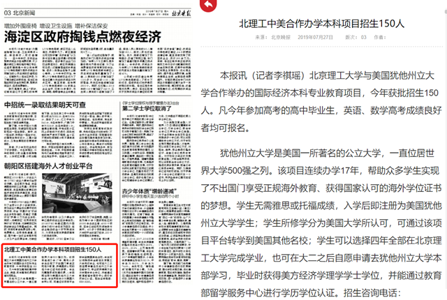 【北京晚報】北理工中美合作辦學本科項目招生150人