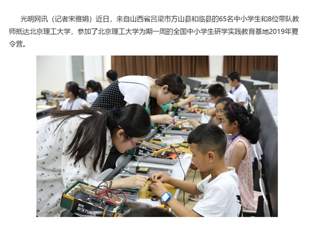 近日,來自山西省呂梁市方山縣和臨縣的65名中小學生和8位帶隊教師抵達北京理工大學,參加了北京理工大學為期一周的全國中小學生研學實踐教育基地2019年夏令營。