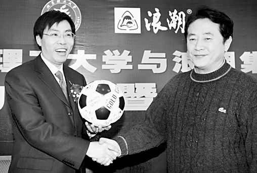 北京理工大學(xué)和浪潮集團(tuán)簽署了合作共建高水平足球隊(duì)的協(xié)議,浪潮集團(tuán)將贊助北京理工大學(xué)足球隊(duì)100萬(wàn)元人民幣。據(jù)悉,這是國(guó)內(nèi)企業(yè)首次贊助大學(xué)足球隊(duì)。圖為該隊(duì)金志揚(yáng)主教練向浪潮集團(tuán)負(fù)責(zé)人贈(zèng)送全體隊(duì)員簽名的足球。