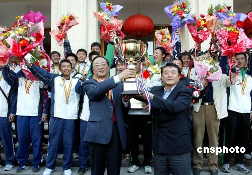 十一月四日,榮獲全國足球乙級聯賽冠軍并晉升甲級聯賽的北京理工大學學生足球隊勝利凱旋,受到該校老師和學生的熱烈歡迎和祝福。2006年11月2日,全國足球乙級聯賽決賽結束,北京理工大學學生足球隊經過激烈拼搏,以3:0戰勝哈爾濱毅騰隊,榮獲全國乙級足球聯賽冠軍和道德風尚獎,球隊主教練金志揚榮獲最佳教練員獎。圖為北京理工大學校長匡鏡明(左)和球隊主教練金志揚(右)高舉獎杯和隊員們合影留念。中新社發 張勤 攝