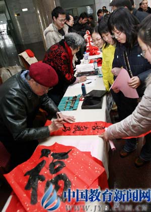 ▲1月26日,北京理工大學精于書法藝術的老教師為家庭經濟困難大學生義務書寫春聯,讓他們把學校的祝福帶回家。本報記者 修伯明 攝