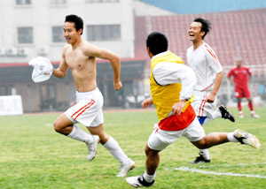 全場突然靜了下來,只剩下狂喜的北理工球員在瘋狂奔跑,疊著人山,歡呼聲在球場里孤獨地響著。很快,南京球迷開始喊出了“北理工,好樣的”的口號,金志揚笑了起來,和隊員們一起揮手向球迷致意。就這樣,這群大學生成為了中甲首輪的主角。而就在幾個小時之前,他們還在忐忑不安地等待自己的首次職業聯賽亮相……
