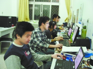 除了上課之外,同學(xué)們都待在工作室,廢寢忘食?!拔覀兠刻煲谶@里耗上十幾個小時?!眲⒀笠贿呎f,一邊不停地用鼠標(biāo)點擊著工作室編的電子書——從第一輯對游戲《仙劍》的模仿,到后來幾輯插圖風(fēng)格的日趨個性化,即使是個外行,也可以看出《盤古OL》的變化和成熟。劉洋說,他們目的很簡單,就是要做中國最好的網(wǎng)游。