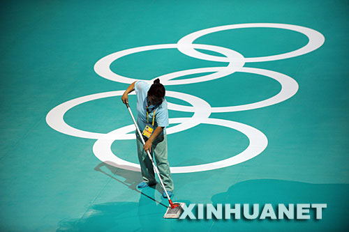 7月27日,一名工作人員在清理北京理工大學體育館內的地面。新華社記者王建華攝