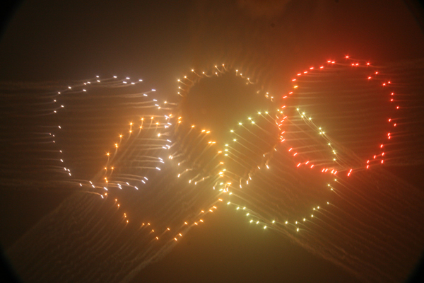 與開幕式相比,閉幕式最有特色的是“鳥巢”內的“五環”煙火,此次呈現出了紅、黃、藍、綠、白五種顏色。煙火倒計時數字的展現運用的是動態而非靜態方式,即觀眾可以在天空中看到數字形成的過程。