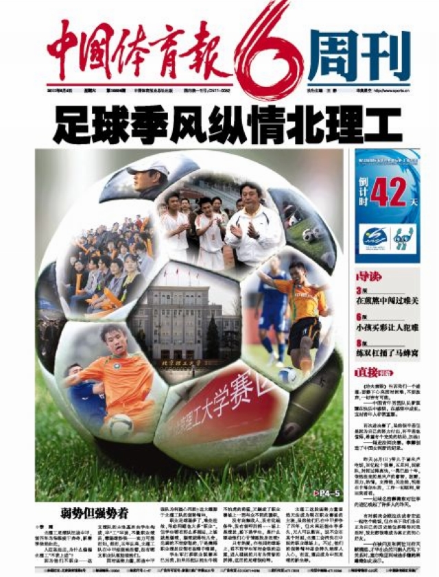 6月4日出版的《中國體育報》以《足球足球季風縱情北理工》為主題,在頭版、第4版、第5版中分別刊登了《直接引語》、《弱勢但強勢著》、《理工足球 學生本色——專訪北京理工大學副校長李和章》、《誰動了北理工的資格》、《總經理“報賬”——專訪北理工足球俱樂部總經理劉啟孝》、《央視擇機擇時轉播比賽——專訪央視體育頻道總監江和平 》、《成長·北理工》、《金3點助力校園足球——專訪總教練金志揚》、《帶學生軍非常快樂——專訪主教練邊立軍 》、《不“職業”依然有作為——專訪隊長盧斌 》、《如果熱愛,其他都是浮云——專訪教練袁微 》等11篇文章,全方位、多角度的對北理工足球隊進行了報道,現將有關內容摘編如下: