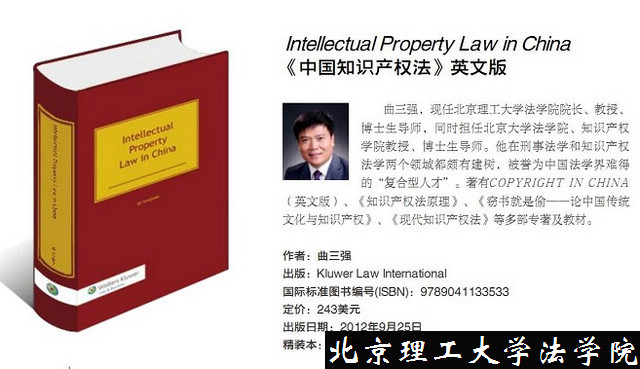 不久前,北京理工大學(xué)法學(xué)院院長(zhǎng)曲三強(qiáng)教授披閱數(shù)載撰寫(xiě)的著作——英文版《中國(guó)知識(shí)產(chǎn)權(quán)法》,由久負(fù)盛譽(yù)的Kluwer Law International出版社在全球同步出版發(fā)行。該書(shū)被認(rèn)為是自我國(guó)改革開(kāi)放以來(lái),為數(shù)不多的大陸作者用英文撰寫(xiě)的全面系統(tǒng)解讀中國(guó)知識(shí)產(chǎn)權(quán)法律制度的著作。該書(shū)的發(fā)行,不僅展示了中國(guó)知識(shí)產(chǎn)權(quán)法研究的豐碩成果,而且還標(biāo)志著中國(guó)知識(shí)產(chǎn)權(quán)法學(xué)理論和法律制度的日漸成熟。