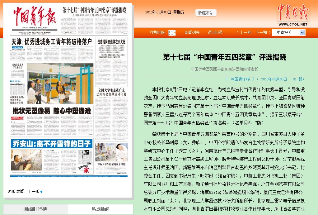 【中國青年報】北理工劉峰獲第十七屆"中國青年五四獎章"