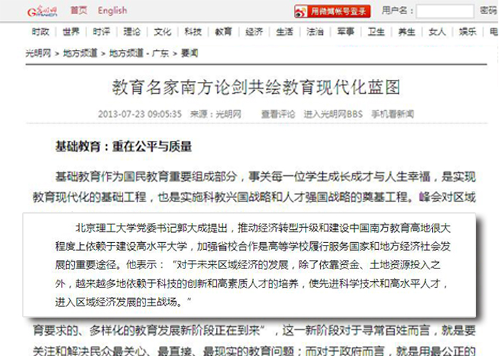 北京理工大學黨委書記郭大成提出,推動經濟轉型升級和建設中國南方教育高地很大程度上依賴于建設高水平大學,加強省校合作是高等學校履行服務國家和地方經濟社會發展的重要途徑。他表示:“對于未來區域經濟的發展,除了依靠資金、土地資源投入之外,越來越多地依賴于科技的創新和高素質人才的培養,使先進科學技術和高水平人才,進入區域經濟發展的主戰場。”