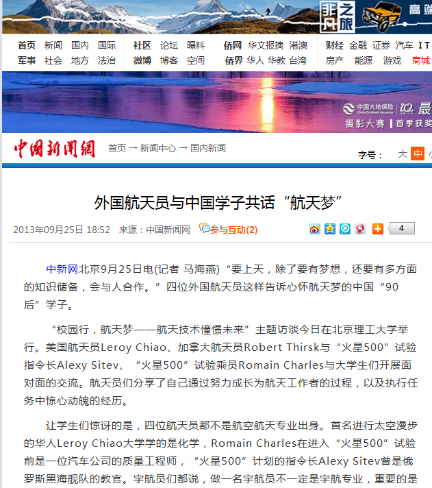 “校園行,航天夢——航天技術憧憬未來”主題訪談今日在北京理工大學舉行。美國航天員Leroy Chiao、加拿大航天員Robert Thirsk與“火星500”試驗指令長Alexy Sitev、“火星500”試驗乘員Romain Charles與大學生們開展面對面的交流。航天員們分享了自己通過努力成長為航天工作者的過程,以及執行任務中驚心動魄的經歷。
