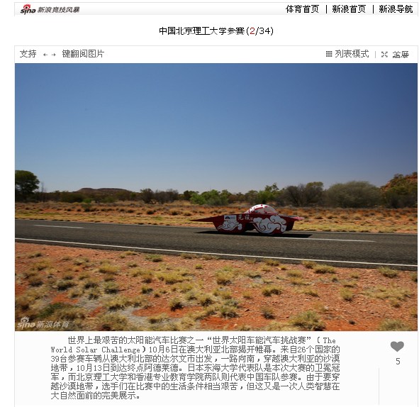 【新浪體育】中國北京理工大學參加“世界太陽車能汽車挑戰(zhàn)賽”