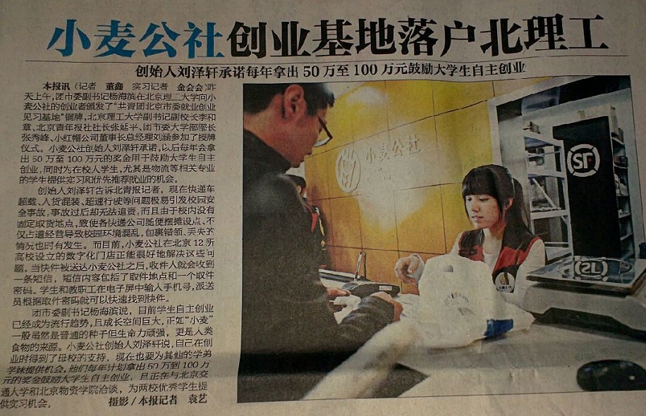 創始人劉澤軒告訴北青報記者,現在快遞車超載、人貨混裝、超速行駛等問題極易引發校園安全事故,事故過后卻無法追責,而且由于校內沒有固定取貨地點,致使各快遞公司隨便擺攤設點、不僅占道經營導致校園環境混亂,包裹錯領、丟失的情況也時有發生。而目前,小麥公社在北京12所高校設立的數字化門店正能很好地解決這些問題。當快件被送達小麥公社之后,收件人就會收到一條短信,短信內容包括了取件地點和一個取件密碼。學生和教職工在電子屏中輸入手機號,派送員根據取件密碼就可以快速找到快件。