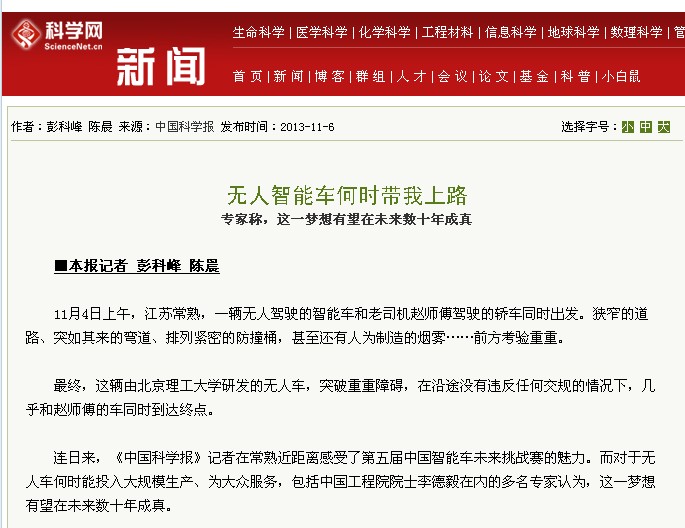 他向記者預測了中國智能汽車應用的時間表:2020年實現結構化道路的智能行駛,2030年實現城市道路等半結構化道路的智能駕駛,2050年實現戰場、沙漠、沼澤等非結構化道路的智能駕駛。
