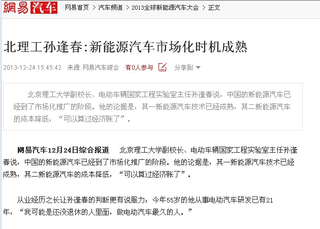 【網易汽車】北理工孫逢春:新能源汽車市場化時機成熟