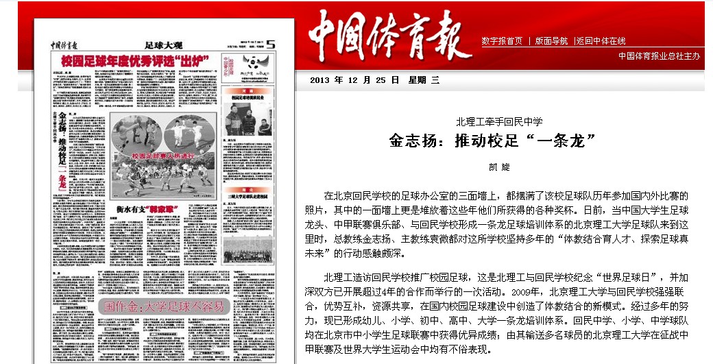 與此同時,針對北京學校足球至今只培養出楊昊一名優秀職業球員的事實,金志揚也道出了自己的憂慮:“在西城區,像回民學校這樣擁有標準足球場的中學,可能只有兩個,整個北京也不多。我們想開展足球,最基本的條件是場地,可是北京呢?我在向領導匯報時也強調過,全國有3000萬大學生,超過了足球強國荷蘭全國的人口。如果學校里推廣起來,這個力量勢不可擋。作為實施體教結合典型的北京理工大學,我們的目的不是讓自己變成職業俱樂部,而是要把這種模式向全國各地推廣。大學的推廣,基礎是中小學,中國足球的根就在于中小學。不推廣校園足球,青少年足球就是空話。我們來到這,就是為了推廣足球進入校園,而不是讓回民學校培養多少優秀球員,是要讓這種模式使我們的校園足球能夠向中學拓展,中學向小學拓展。北京市如果有100個回民學校的足球發展起來,大學就不存在人員匱乏的現象,中國足球也不會存在這樣的問題。道理很簡單,但真正做到不容易。體育就是教育的一部分,二者不能分離。”