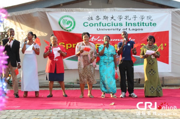 國際在線報道(記者 張威偉):29日,尼日利亞拉各斯大學孔子學院2014馬年春節晚會隆重舉行。中國駐拉各斯總領事館副總領事邱艦、法國駐拉各斯總領事、美國駐拉各斯總領館代表、中資企業、華人華僑代表以及拉各斯大學校方領導應邀觀看了晚會。