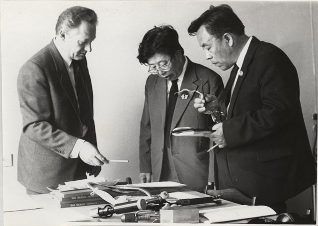 1990年6月,周立偉(居中)隨北理工訪蘇代表團參觀古比雪夫航空學(xué)院實驗室