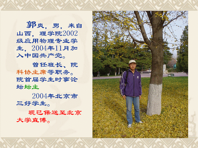 郭爽,男,來自山西,理學院2002級應用物理專業學生,2004年11月加入中國共產黨。曾任院科技協會主席,馬學會時事評論員、班長等職務。2004年被評為“北京市三好學生”。現已保送至北京大學物理學院直博。