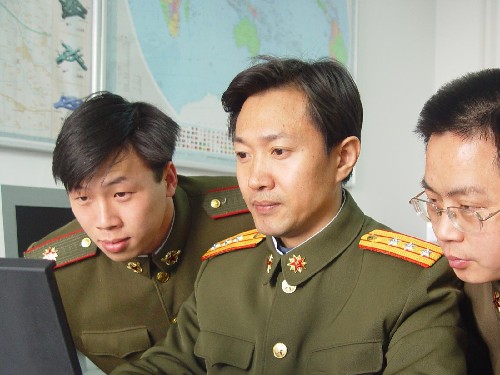 何玉彬(中)在與戰友進行新課題研究。從參謀到走上領導崗位,第二炮兵裝備部科研部裝備技術預先研究辦公室主任何玉彬,以強烈的使命感投入科研攻關,先后組織或參與完成新型裝備發展論證、規劃制定和技術攻關等20多項重大課題,牽頭完成“復合環境下裝備技術測試與評估系統”等多項重大科研項目,其中4項獲得國家部委或軍隊科技進步獎。他被第二炮兵評為優秀共產黨員、首屆“十大礪劍尖兵”,榮立了一等功。新華社記者張選杰攝